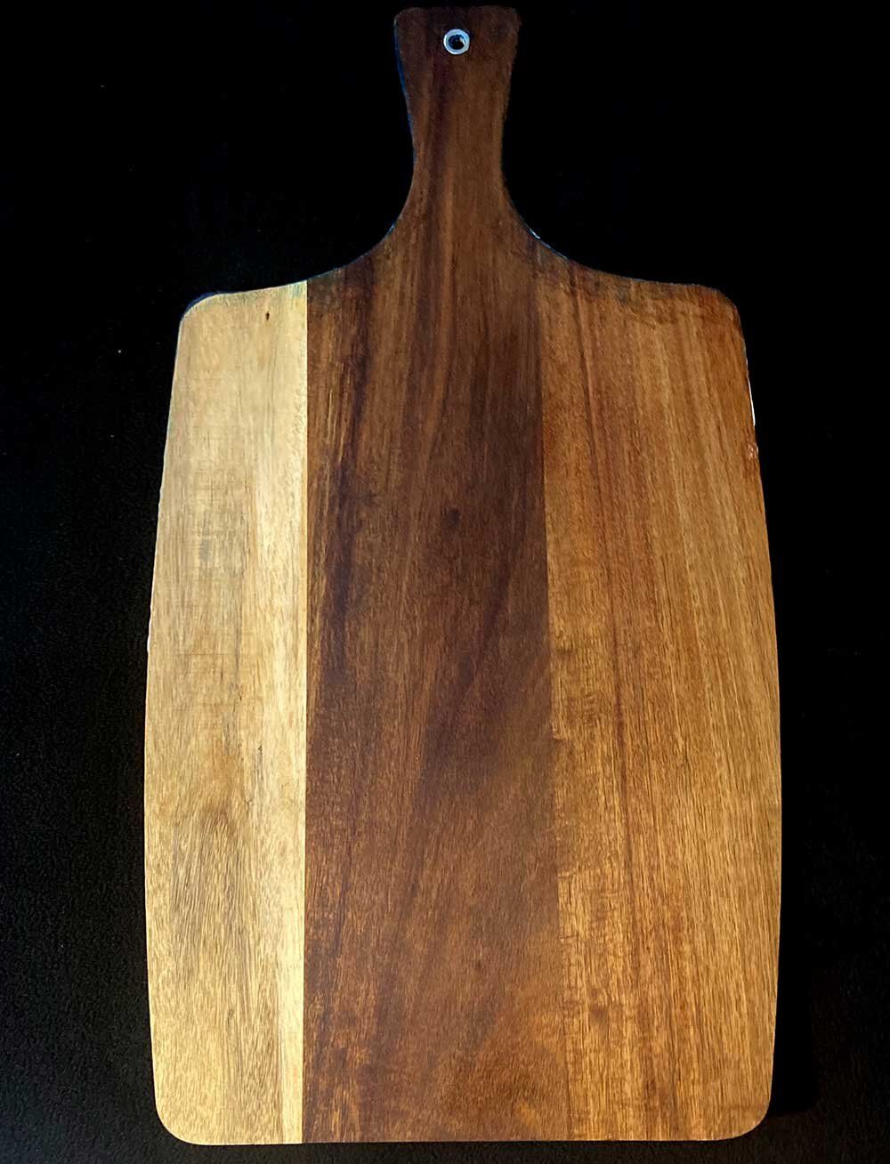 Protected with food-grade natural oil. It can be used as a cutting board or charcuterie tray. Please avoid cutting over the resin area as it could damage the design. Instead, to use as a cutting board, place it on top of a kitchen towel with the design facing down.