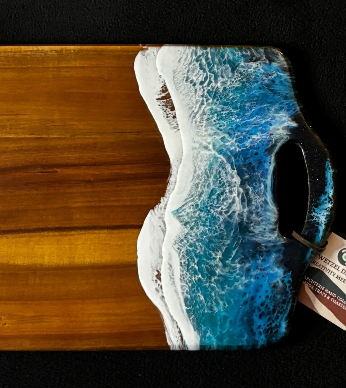 Protected with food-grade natural oil. It can be used as a cutting board or charcuterie tray. Please avoid cutting over the resin area as it could damage the design. Instead, to use as a cutting board, place it on top of a kitchen towel with the design facing down.