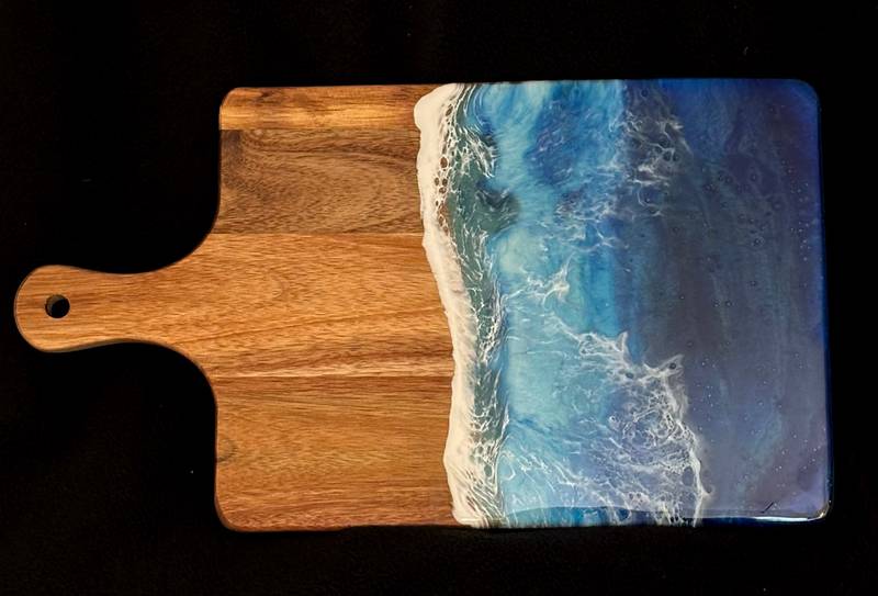 Protected with food-grade natural oil. It can be used as a cutting board or charcuterie tray. Please avoid cutting over the resin area as it could damage the design. Instead, to use as a cutting board, place it on top of a kitchen towel with the design facing down.