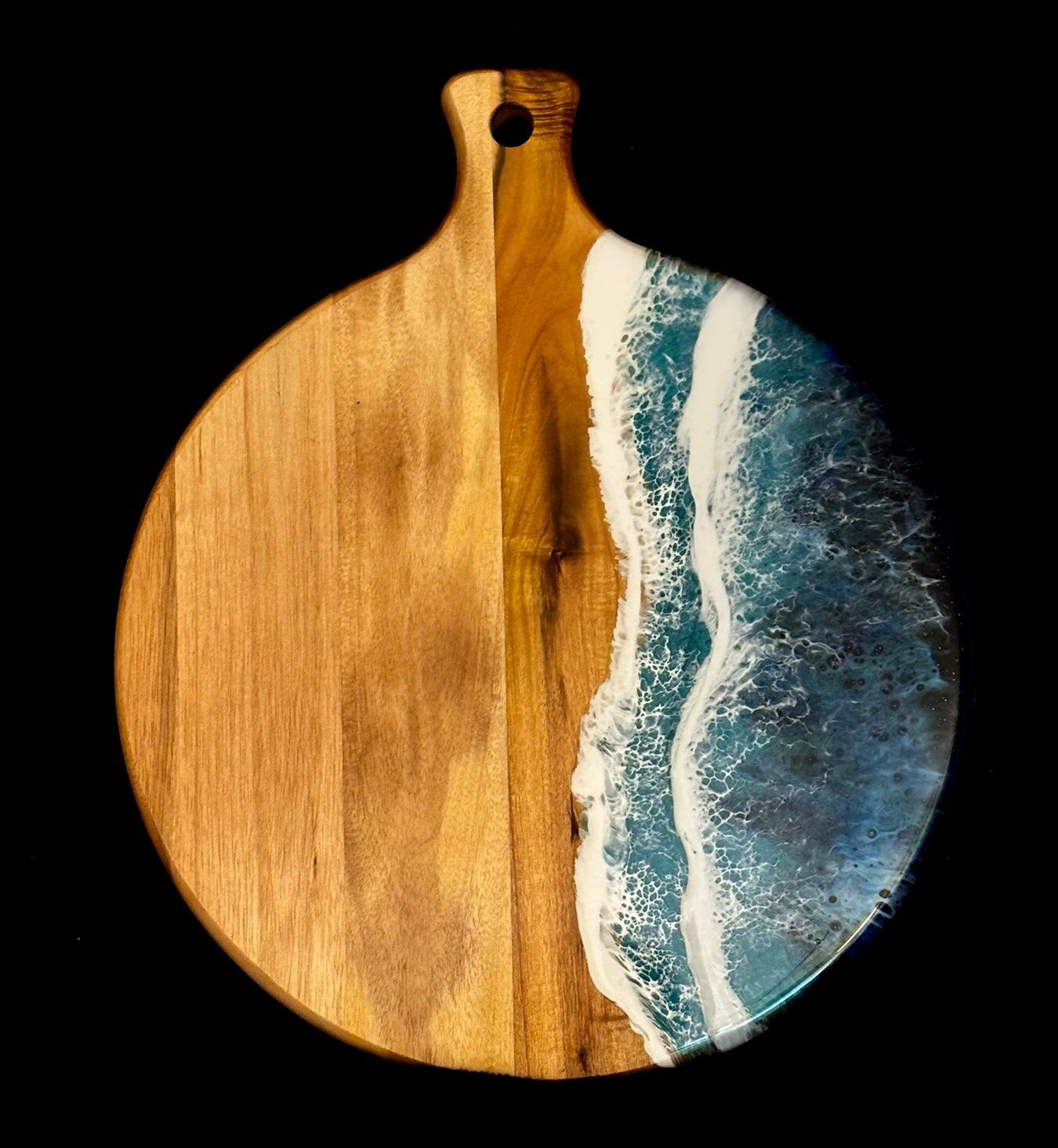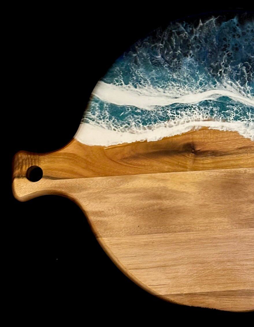 Protected with food-grade natural oil. It can be used as a cutting board or charcuterie tray. Please avoid cutting over the resin area as it could damage the design. Instead, to use as a cutting board, place it on top of a kitchen towel with the design facing down.