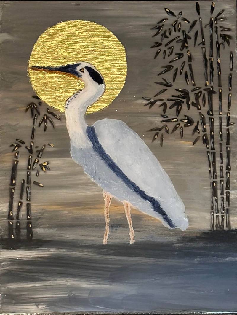 Among the slender bamboo shadows, the moon’s golden light caressed the heron’s form, crowning it with a soft halo. The air hummed with tranquility, and the scene became a living poem — nature’s own portrait of balance and serenity. In that sacred silence, the heron was not merely a bird, but a symbol of peace between earth, water, and sky, a quiet guardian of the night’s golden heart.