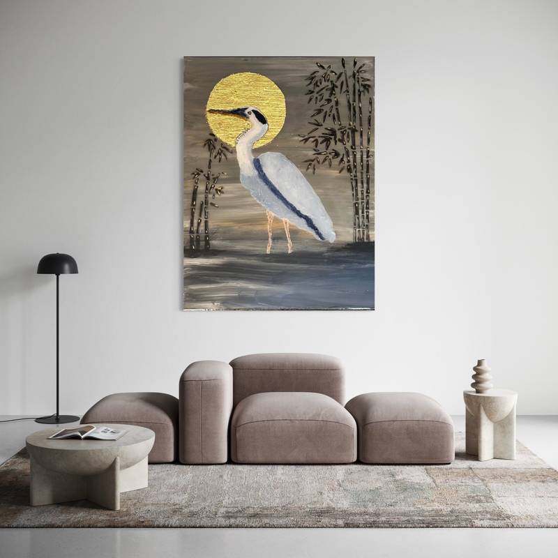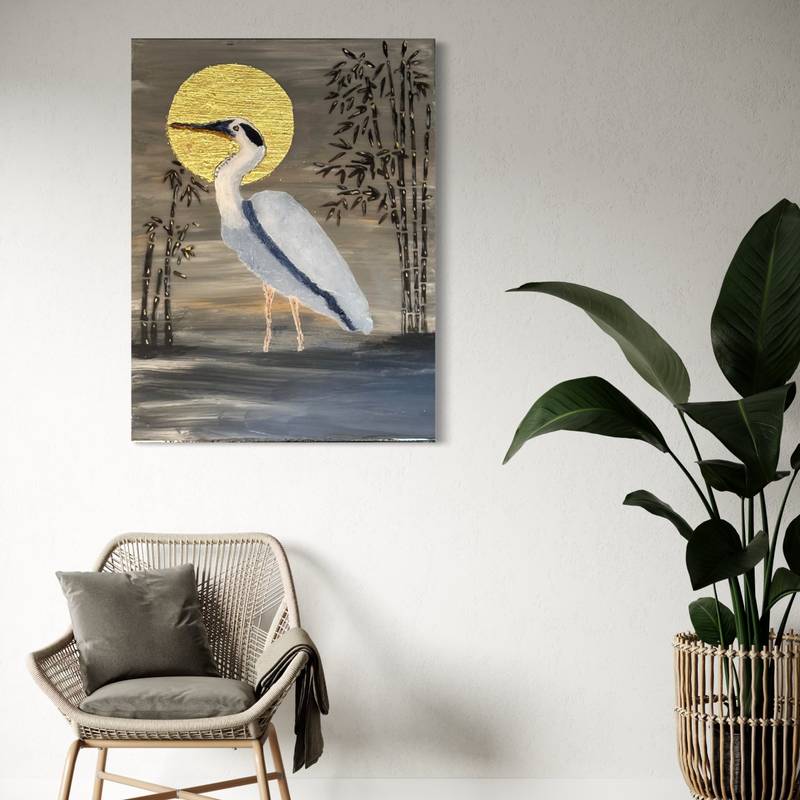 Includes : Stretch Canvas 16″ L x 12″ Wide x1 .5″ Depth Wall Art “Blue Heron Golden Moon”
