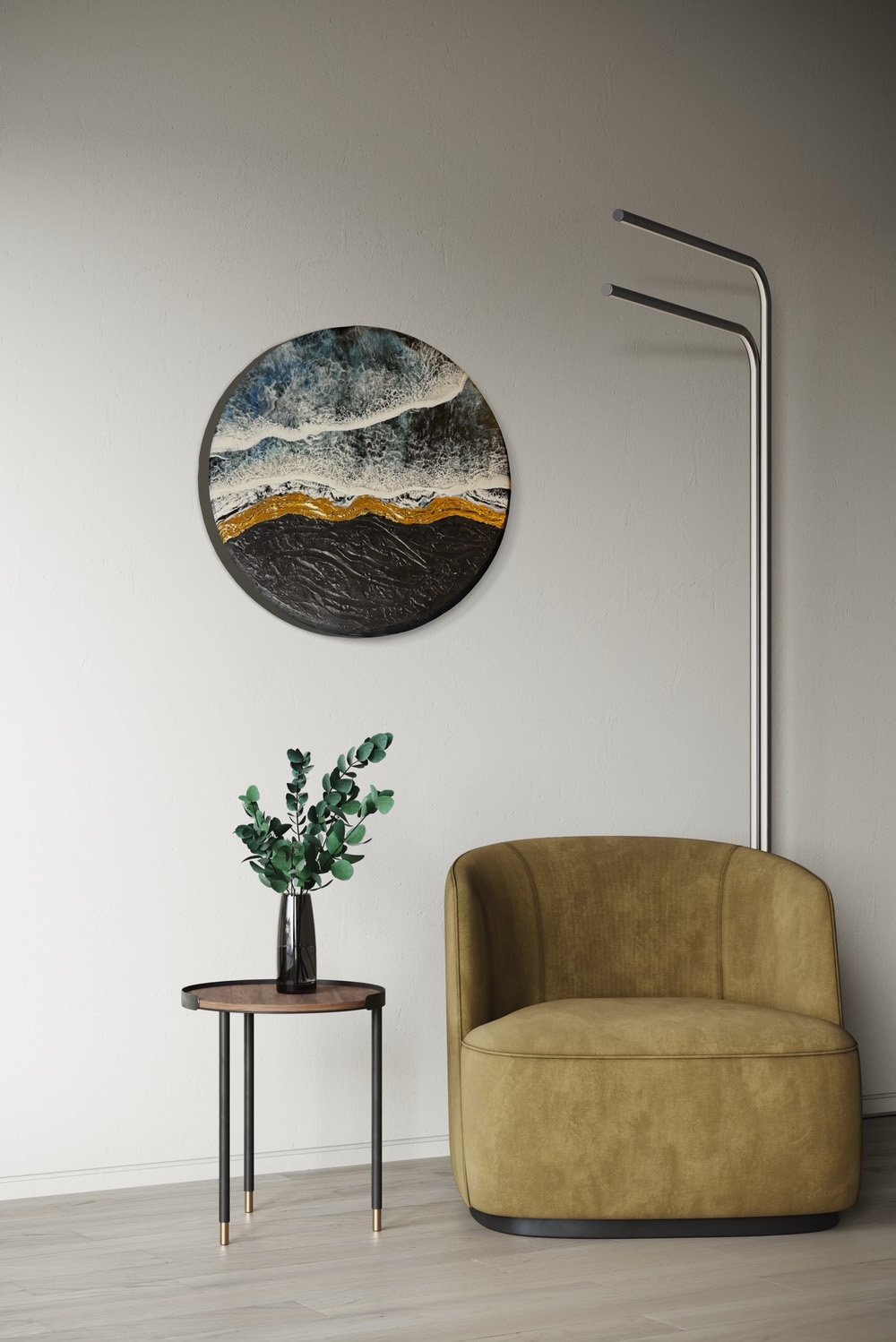 Materials include Acrylic Paint, Epoxy Resin, Australian Pigment Paste, Modeling Texture Paste, Gold Leafing, Matt Varnish.
