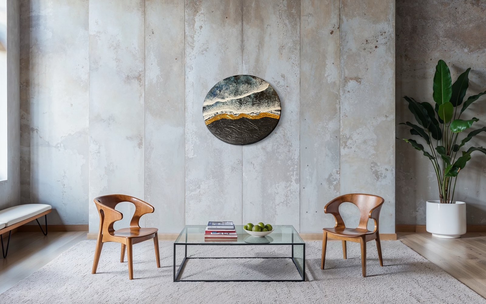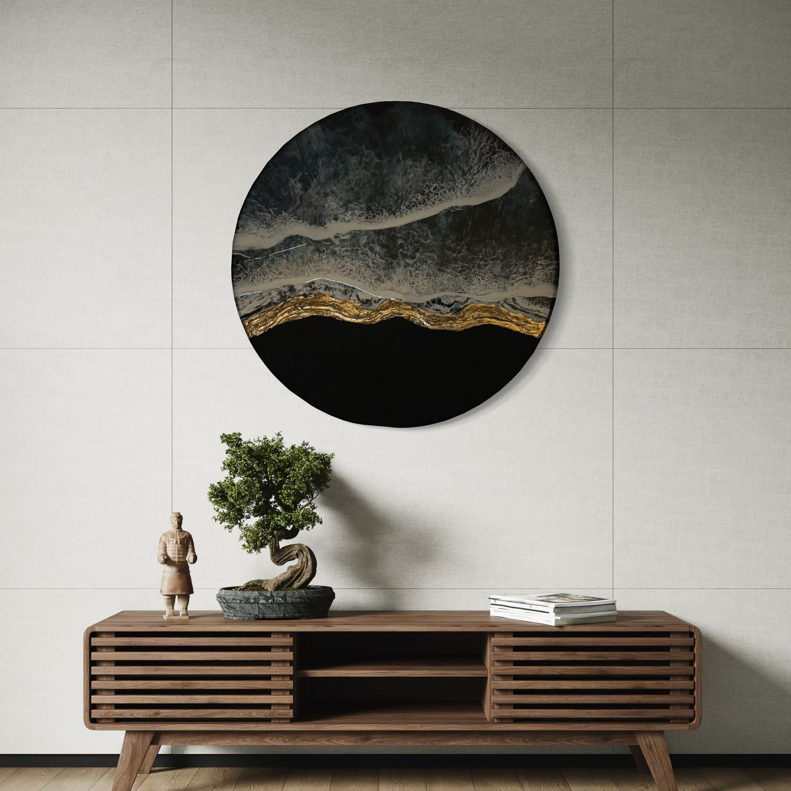 Below, the dark, textured cliffs stand firm against the tide, their carbon-black surface rich with depth and mystery. The intricate texture suggests the rugged resilience of coastal rock, a silent observer of the ever-changing ocean. A radiant gold accent traces the shoreline, adding an ethereal glow that mimics the way sunlight kisses the earth at dusk. This gilded boundary between land and water is a striking reminder of balance—where motion meets stillness, chaos meets serenity, and the infinite sea meets the enduring cliffs.