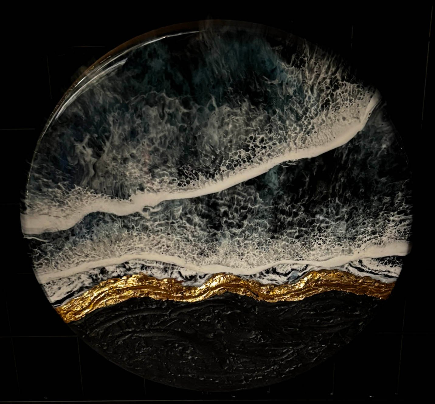 The piece captures the raw beauty of nature’s contrasts—where the restless, rolling sea meets the steadfast, darkened cliffs. The deep, swirling blues of the ocean blend seamlessly into frothy white waves, crashing onto the shore in a mesmerizing dance. The resin’s high-gloss finish enhances the illusion of movement, making the waves feel alive, their energy palpable. Each delicate cell formation and ripple effect mirrors the untamed motion of the sea, evoking both tranquility and power in a single, breathtaking moment.