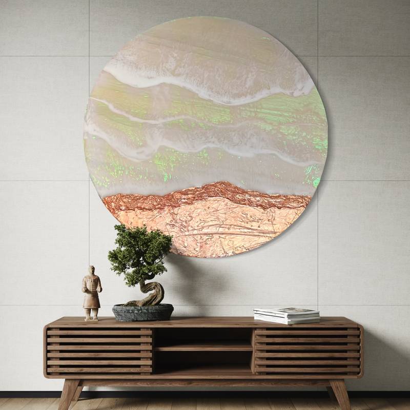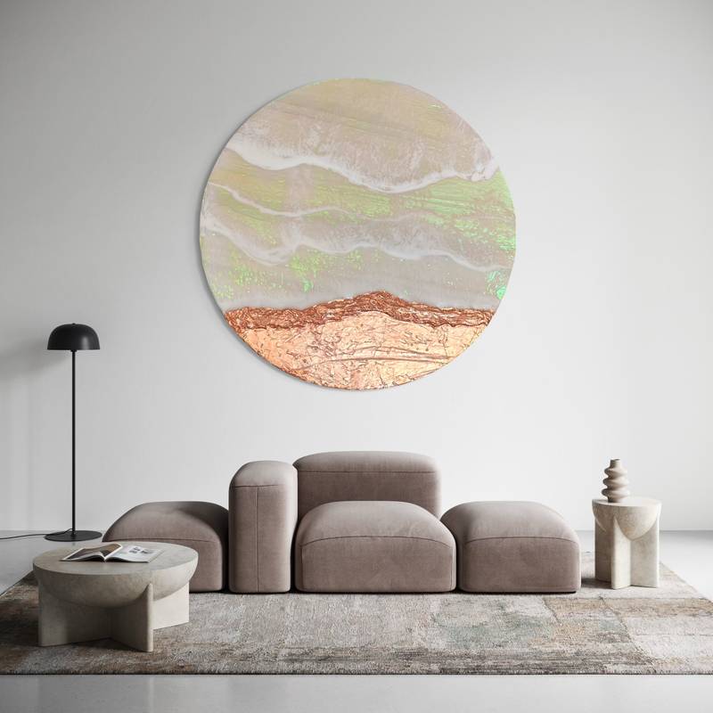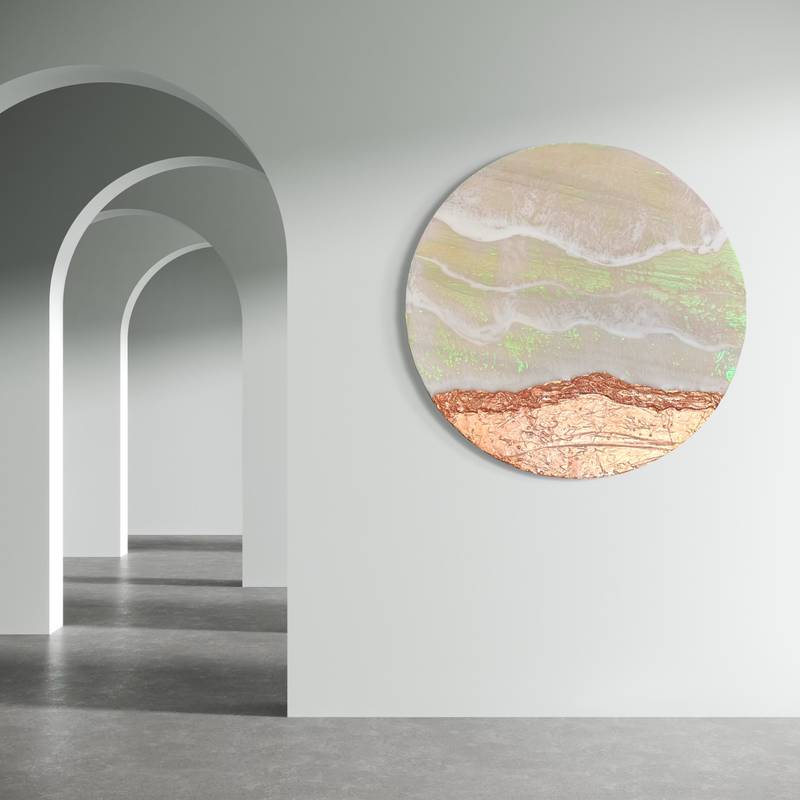 Contrasting the luminous waters, the striking copper cliffs rise with bold texture and depth. Their rich, earthy hues range from deep bronze to hints of burnished gold, reflecting the raw strength of the land. The jagged edges, adorned with metallic leafing, add a sense of rugged elegance, reminiscent of Germany’s coastal landscapes. This fusion of fluidity and solidity creates a captivating harmony, where land and sea meet in a timeless, artistic expression of nature’s grandeur.