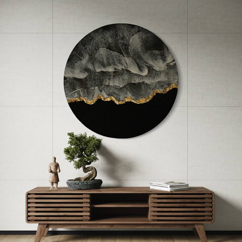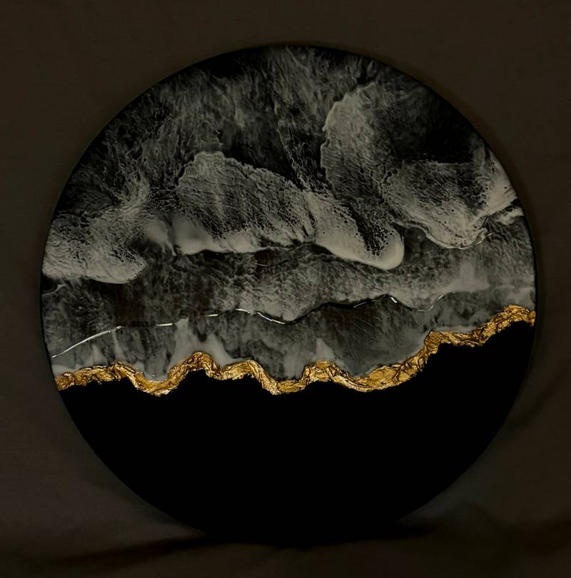 Materials include Acrylic Paint, Epoxy Resin, Australian Pigment Paste, Modeling Texture Paste, Gold Leafing, Matt Varnish, Musou Black Acrylic- (Blackest Paint in the world from Japan)