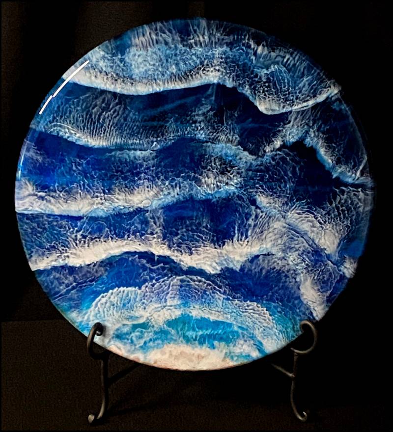 A hand crafted 18-inch Wall Art /Lazy Susan, made of acacia wood. Its surface holds the essence of the sea—a Beach Ocean Theme captured in glossy epoxy resin.